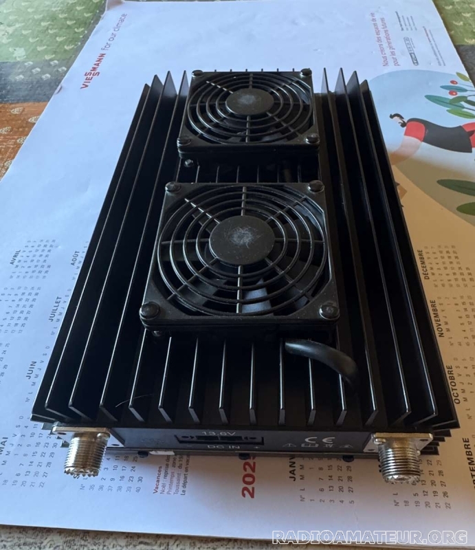 Fréquence : bande amateur 10 m (1,8-30 MHz avec LPF) Alimentation : 13,8 V CC +/- 1 V 50 A Courant d'entrée : 35 A max Puissance d'entrée : 1-10 W max (tous les modes Puissance de sortie : 200 W max ROS d’entrée : 1,1-1,5:1 Fusible : 3x12A rapide 5x20mm Dimensions : L 300 l 190 H 83 mm Poids : 2 200 g Ventilation modifier avec régulateur programmable de température et sonde, en parfait état cosmétique et de fonctionnement, facture, pas de carton d’origine.