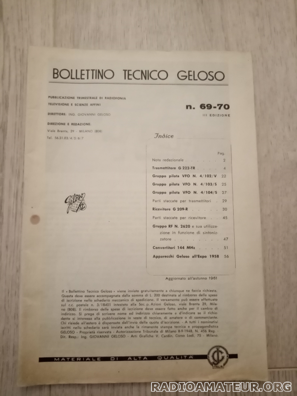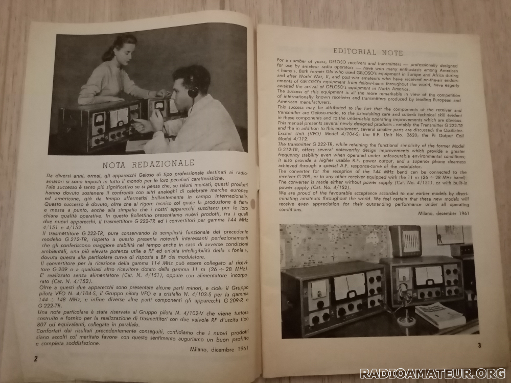 Bulletin technique dédié aux émetteurs-récepteurs Geloso En italien et en anglais En noir et blanc Décembre 1961 Livret souple sans couverture 56 pages 16,9 x 23, 9 cm 70 g