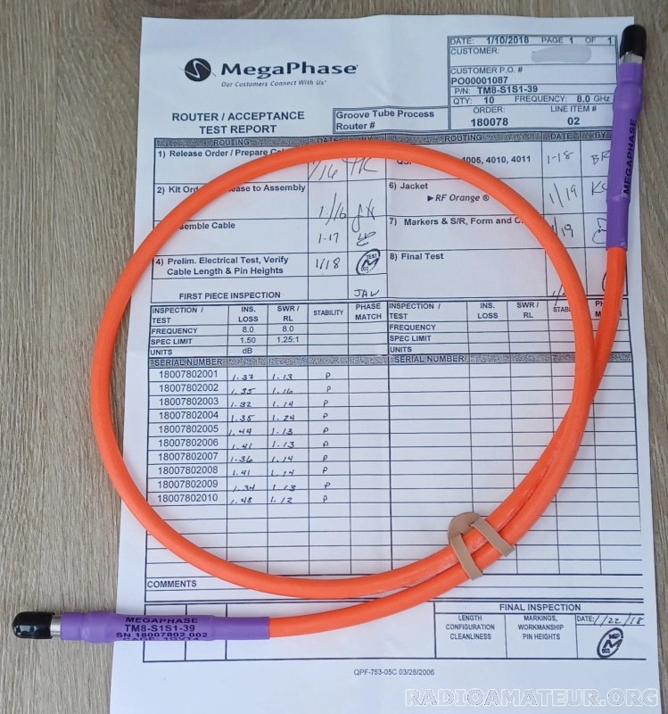 Vend câbles coaxiaux hautes performances de la marque Megaphase, série "Orange" (TM8) en 20". Idéal pour banc de mesure, VNA, ou station SHF exigeante. Ces câbles sont reconnus pour leur excellente stabilité en phase et leur robustesse en laboratoire. Ils sont NEUFS. Chaque câble porte un numéro de série et a été qualifié par le fabricant. En cas de besoin, je peux faire des mesures avec mon VSG (max 6GHz) + Spectrum. Data sheet disponible ici (voir famille TM32): https://megaphase.com/wp-content/uploads/2017/01/MegaPhase-RF-Orange-110-Cable-Data-Sheet_02212025.pdf