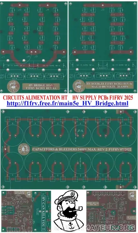 5 circuits imprimés percés, avec vernis épargne et sérigraphie. Cartes "Soft start" et "Safety & trip" (90x110 mm), cartes "Pont de diodes et fusibles" et "Doubleur et fusibles" (150x200 mm), carte "Capas & bleeders" (150x255 mm). Toutes les documentations: schémas, nomenclatures, docs des composants etc. sont disponibles http://f1frv.free.fr/main5e_HV_Bridge.html . QSJ 50 Euros pour 1 jeu, 90 Euros pour 2 jeux, si enlèvement à Conflans 78700. Avec frais de port recommandé, suivi et assuré (France METROPOLITAINE, 3A et C3 uniquement): 65 Euros pour 1 jeu, 111 Euros pour 2 jeux. Paiement par PAYPAL. Autres annonces: http://f1frv.free.fr/Flea_Market.html QSJ Postage fees included for European Union and Switzerland, for 1 set: 71 Euros. for 2 sets: 118 Euros. Payment by PAYPAL. Other quantities and rest of the world: cotation ON REQUEST.