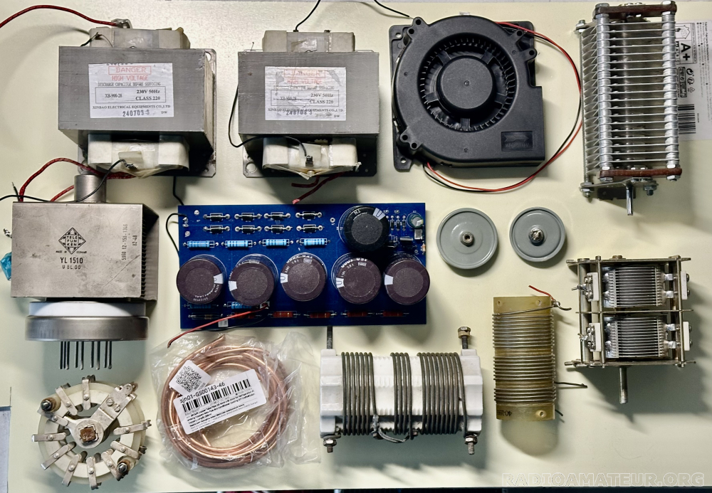 Ensemble de pièces constitutives d’un amplificateur HF de puissance comprenant ; - une tétrode neuve Telefunken YL1510 - 2 transformateurs micro-onde 2300V - une platine de redressement comprenant 6 condensateur de 1000uF / 450V ainsi que l’alimentation écran (300V) régulée. - 1 CV HT 230 pF - 1 CV 920 pF - 1 3300 pF 10kV - 1 1500 pF 20 kV - 1 commutateur stéatite QRO 2 galettes / 9 positions - 2 selfs - 1 turbine - 2m de tube de cuivre 4mm Le transformateur de chauffage (12.6V/4A) ainsi que le transformateur d’alimentation écran sont à prévoir.