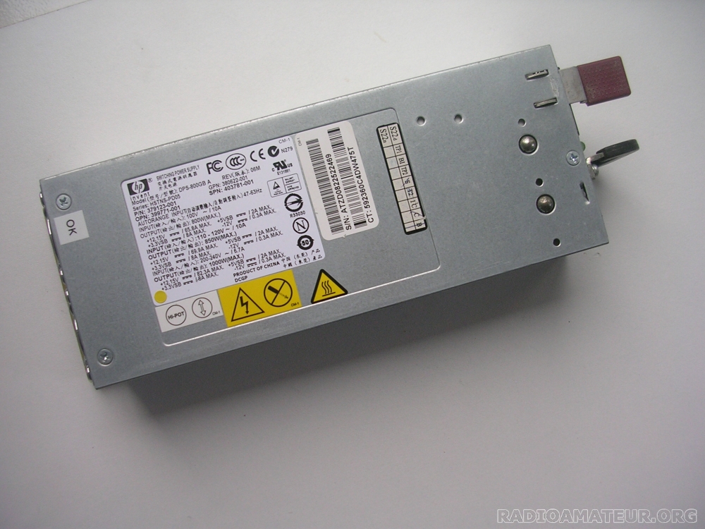 Vends bloc alimentation 12V 82A HEWLETT PACKARD référence DPS-800GB - Modifiable en 13,8V (Documentation fournie pour la modification) - Dimensions hors tout : 9 x 6 x 27cm approx. - Plusieurs exemplaires disponibles - Mise en série possible pour obtenir 24V 82A - Prix : 20 Euros pièce + port ( Pour une pièce pour la France métropolitaine le tarif via Colissimo est de 13,20 Euros ou via Mondial Relay à 8,600 Euros )