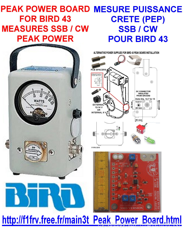 Platine à installer dans un BIRD43 (ou autre wattmètre), pour affichage de la puissance crête (PEP). Dimensions 59 x 69 mm . Platine seule , prête à l'emploi (après calibration par vous). : 25 Euros si remis en main propre. Avec port recommandé et assuré, France METROPOLITAINE, 3A & C3 : 36 E par PAYPAL. Option: platine AVEC accessoires pour installation: Interrupteur 3 poles, LED+support, connecteur d'alimentation, male et femelle, support et connecteur pour pile 9 V, 2 entretoises #8-32 pour pouvoir utiliser les bouchons de rechange sur les côtés du BIRD. Documentation: http://f1frv.free.fr/Annonces/BIRD43-PEP-SMD.zip Le lot: 50 Euros si remis en main propre. Avec port, France METROPOLITAINE, 3A & C3 : 65 E par PAYPAL. Prix par quantités sur demande. Board to be installed into a BIRD43 (or other wattmeter), to have PEAK power reading (PEP). For rest of the world: Board only, ready to use (after calibration by you), with registered mail fees: 39 Euros by PAYPAL. Option: board AND parts for installation: Switch 3PDT, LED+support, supply connector, male and female, 9V battery support and connector, 2 spacers #8-32. Full set with registered mail fees: 72 Euros by PAYPAL.