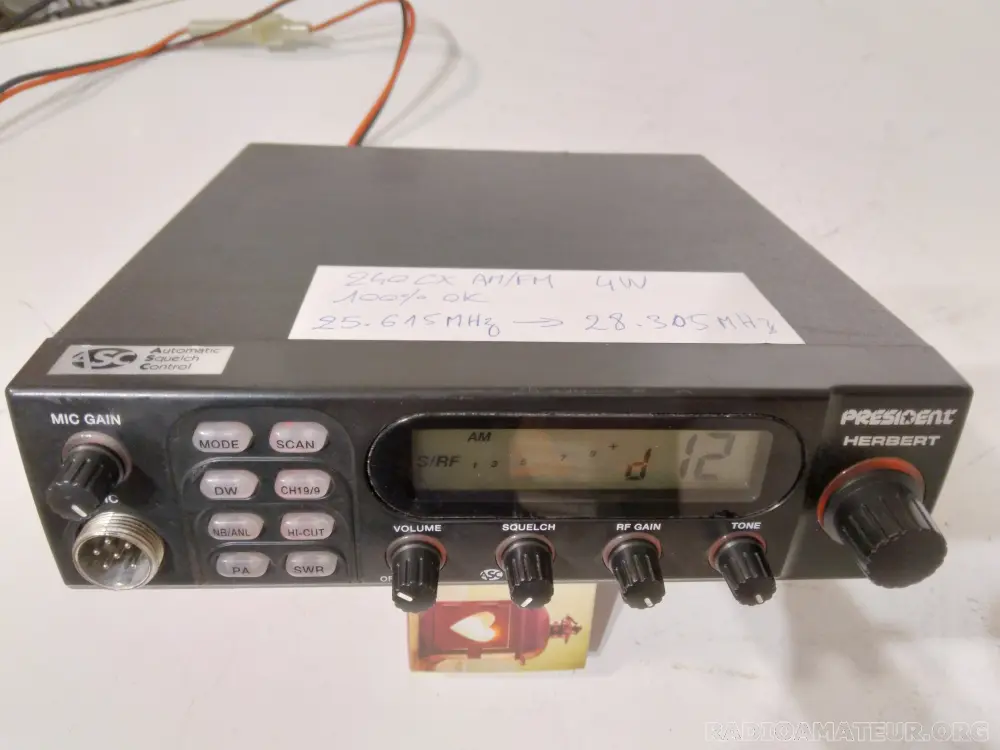 Bien lire l'annonce s'il vous plaît : CB President New Herbert ASC 240cx 4w AM FM en excellent état de présentation et de fonctionnement. 240 canaux répartis en 6 bandes A B C D E F de 40 canaux (touche PA) couverture en fréquence: de 25.615MHz à 28.305MHz. Rétro-éclairage des touches, filtre DW, réglage tonalité, option ASC (automatique squelch control) installée. Livré sans micro et sans cordon d'alimentation. Prix 20 euros