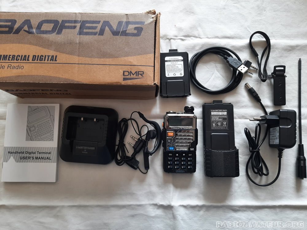 Vends émetteur récepteur Baofeng DM5R Plus VHF et UHF analogique et numérique DMR. Cet appareil fonctionne sous Open GD77 avec un codeplug couvrant la totalité des relais VHF et UHF Français numérique et analogique, la bande marine etc. Livré avec chargeur, batterie, batterie de grande capacité, câble de programmation, dragonne, clip ceinture, kit piéton (oreillette et micro), notice et emballage d'origine. Paiement Paypal, Expedition par Mondial Relay.
