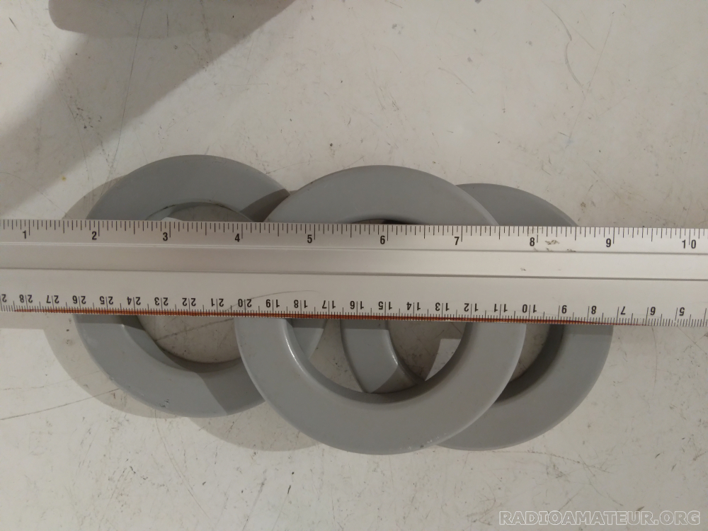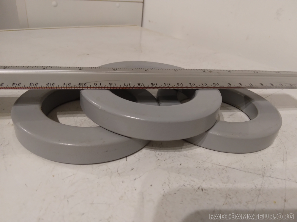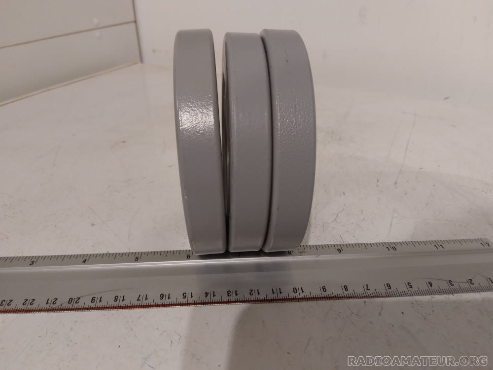 Lot de trois tores ferrite forte perméabilité pour antiparasitage CEM ou autres balun bandes basses ou choke balun. Diamètre extérieur 105mm, diamètre intérieur 66mm, hauteur 16mm. Poids des trois tores 1060g. Prix du lot de trois 28 euros