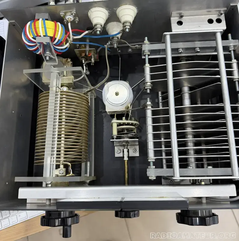 Tuner aux composants démesurés vraiment US. Sortie coax OU bifilaire OU long fil. Une très bonne réalisation. Fonctionne très bien. Un seul bémol, les afficheurs en façade doivent être réalignés. Une fois les accords réalisés la bande passante est très large. Pour OM confirmé. Je reste à votre écoute. La photo sans cache montre bien le sérieux de la conception. Le cache est présent sur la boîte à la livraison. pas de souci.