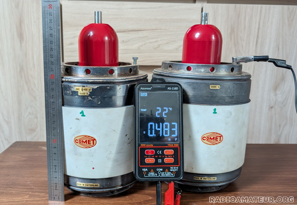 Bonjour, Vend 2 condensateurs variables sous vide de marque COMET. Capacité ~15pf a ~480pf Isolation 55kv Parfait état de marche, testé ok Idéal pour construction antenne bandes basses 80/160m / Boites d'accord etc... Vente en 1 lot, pas de dissociation. Envois possible en 2 cartons séparés. Poids 20kg pièce ! 500€ la paire