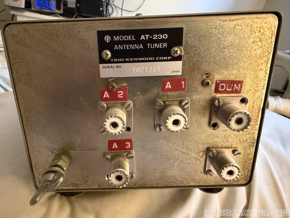 Kenwood Antenna Tuner model AT 230 mesure de puissance jusqu'à 200 watts excellent état design et fonctionnement 3 sorties d'antennes débrayables au choix + connecteur châssis 259 charge non-rayonnante En positionnant le sélecteur sur la charge non rayonnante, vous pouvez connecter une antenne 50 Mhz par exemple et cela permet de gérer 4 antennes sur la même AT 230 puisque qu'il n'y a pas d'accord possible sur la dummy load...