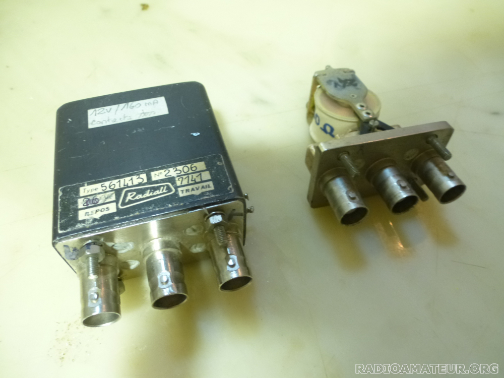 Vend 1 relais coax Radiall bobine 12V / 160 mA. Connectique BNC femelle. Avec CONTACTS de masse.Fmax 4Ghz. Vérifié OK. Le 2 ème sur la photo est en 26V mais 1RT classique et sans capot ( vendu seul 30€ ) .Envoi via MR possible.