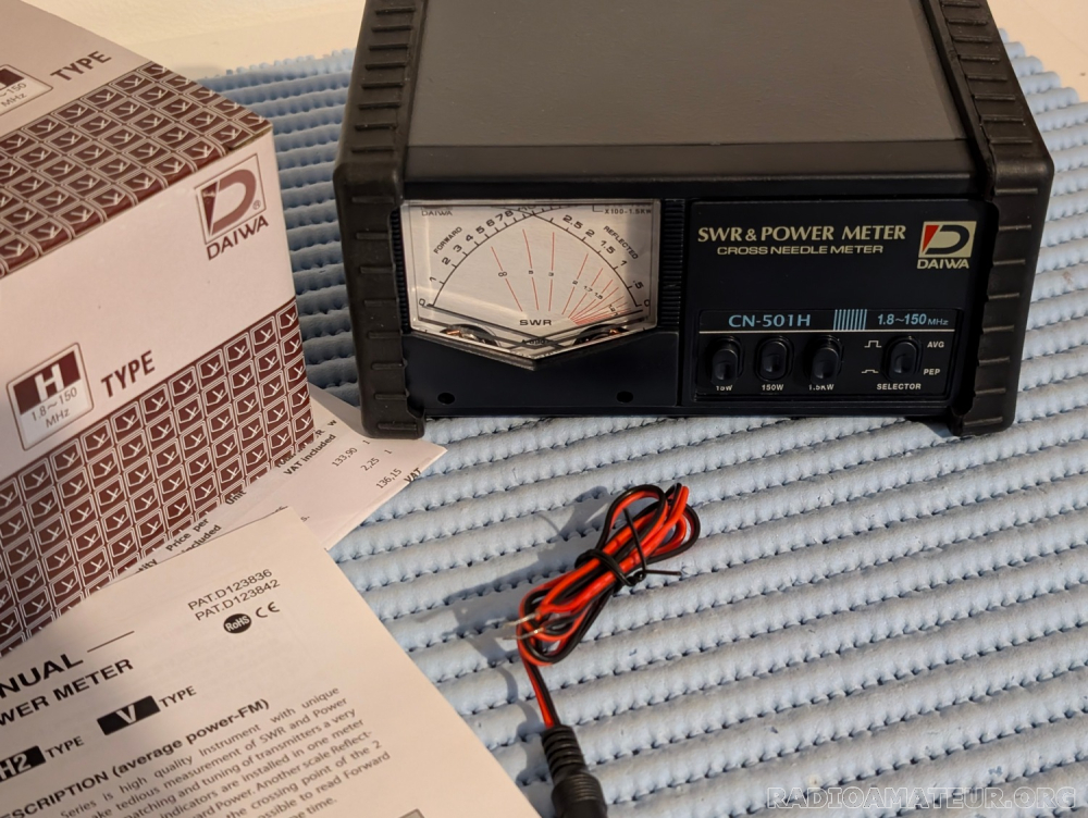 Vends, état neuf et sous garantie, wattmètre à aiguilles croisées Daiwa CN-501H. Gamme de fréquences 1,8 à 150 MHz, calibres 15, 150 et 1500 W pleine échelle. Livré dans son emballage d'origine avec notice, cordon d'alimentation 12 V et facture. Envoi par Mondial Relay en double emballage.