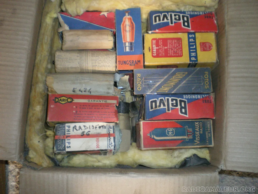Exceptionnel carton rempli d'environ 3kg de tubes des années 1930 à 1950 certains neufs en emballage d'origine. Nombre important de tubes variés (je n'ai pas compté).Pour les Amateurs d'anciens postes de TSF. Paiement par paypal, envoi Mondial Relay. Une photographie possible de la couche supérieure du carton !. 73 à tous.