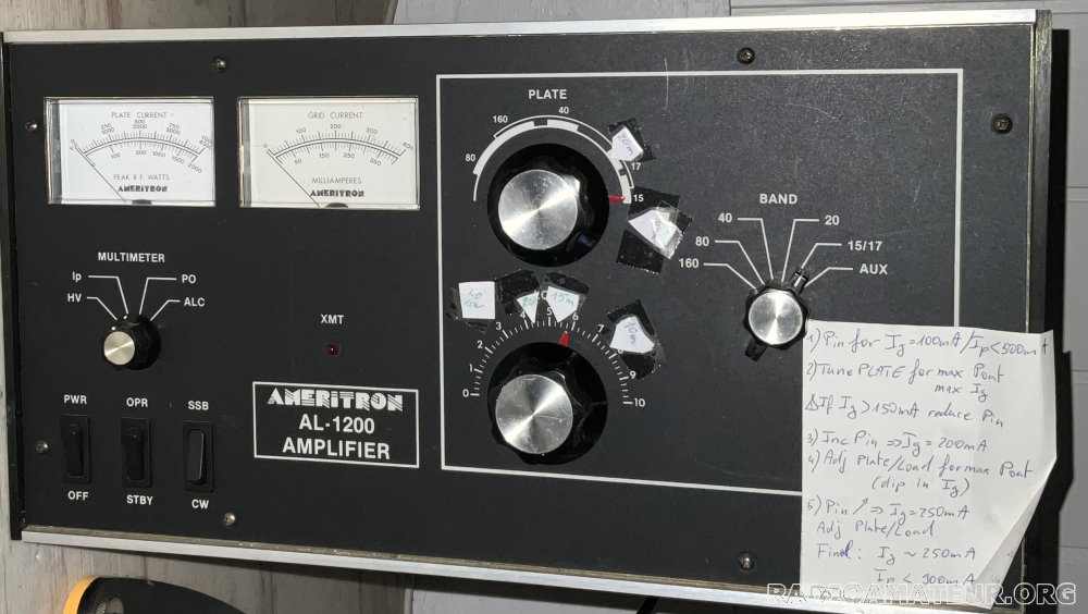 L’ampli est un Ameritron MKI, avec tube 3CX1200A7 (en parfait état). - j’ai augmenté la tension d’anode - refait l’alim. (en utilisant des capas à très faible ESR, vissées sur le PCB) - ajusté la réaction négative. Stable partout. => L’ampli sort au minimum 1’700W PEP (double ton) sur toutes les bandes et les IMDs: (< -30dBc) à Pmax. L’appareil se trouve en Suisse romande et si la personne vient le chercher, il est possible de le tester sur place (idéal). Pour ceux qui auraient besoin d’un ampli tampon, je vends aussi un ALS-500M, avec une alimentation 80A, qui couvre de 0 à 30V (de mémoire). Je fais tourner l’ampli à 26V (optimal). Avec cette paire, on peut driver le tout avec moins de 50W. Je ferai un prix de gros si qq achète le tout. 73’s Patrick