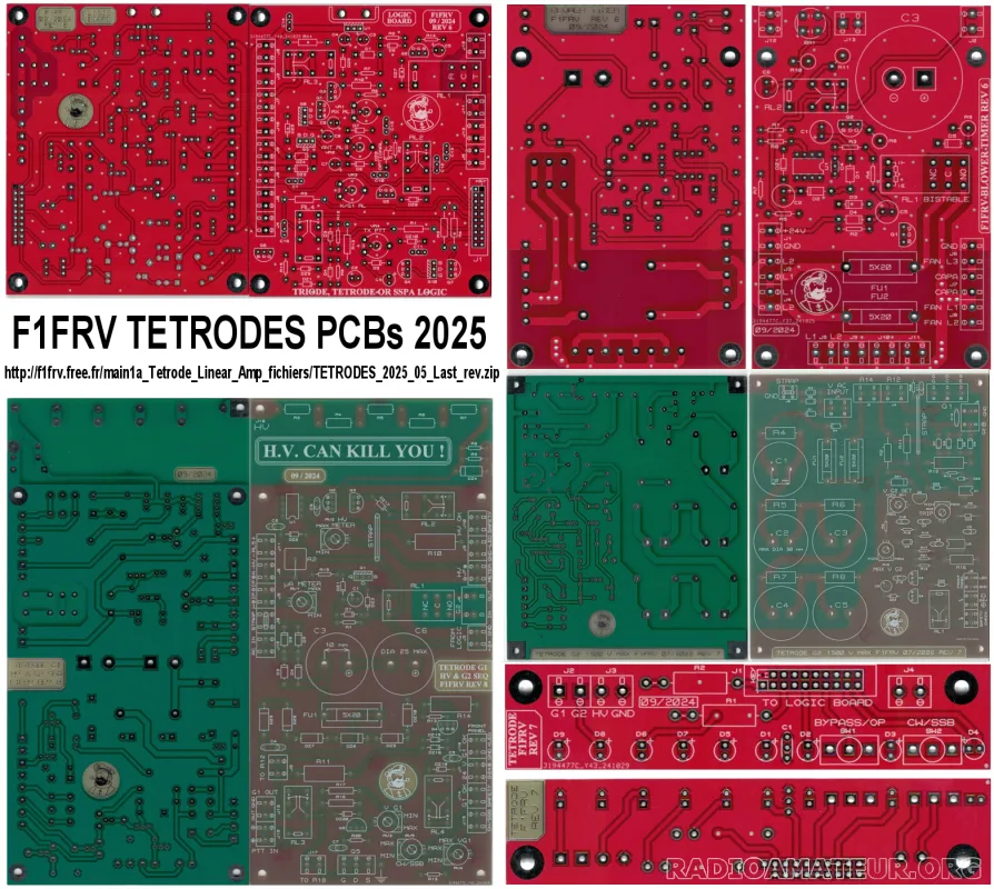 Jeu de 5 circuits double face, trous métallisés, 2 vernis épargne et 1 sérigraphie. Carte logique, carte face avant, carte temporisation arrêt ventilateur, carte alimentation Grille 1, carte alimentation grille 2 avec 5 connecteurs pas de 7.62 inclus. Toutes les documentations: schémas, nomenclatures, docs des composants etc. sont disponibles http://f1frv.free.fr/main1a_Tetrode_Linear_Amp.html QSJ: 60 Euros pour 1 jeu, 110 Euros pour 2 jeux, si remis en main propre (78700). Avec frais de port recommandé, suivi et assuré (France METROPOLITAINE, 3A et C3 uniquement): 76 Euros pour 1 jeu, 130 Euros pour 2 jeux. Paiement par PAYPAL. For tetrode amplifier : Logic card, Front plate card, Delayed blower stop card, Grid 1 card, Grid 2 card wit 5 connectors pitch 7.62 included. QSJ Postage fees included (outside METROPOLITAN France, 3A & C3 ) delivered against signature with insurance & tracking: 87 Euros for 1 set. Payment by PAYPAL.