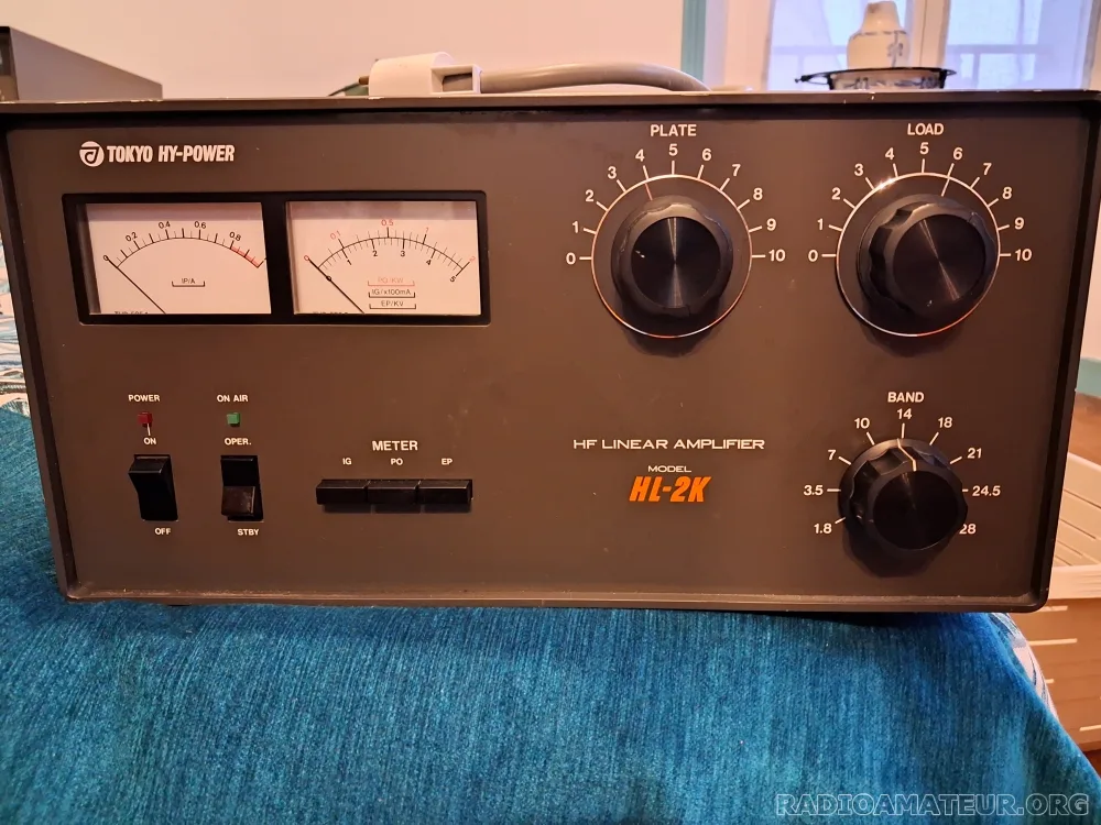 Suite au décès de Claude F9OE, nous mettons en vente au profit de sa veuve un amplificateur Tokyo HY-Power HL-2K. Très bel état esthétique et mécanique, MAIS ne fonctionne pas (absence de polarisation sur les tubes, mais présence de HT). Vendu en l'état, l'acheteur devra considérer que les tubes (une paire de 3-500z) sont HS. A prendre sur place.