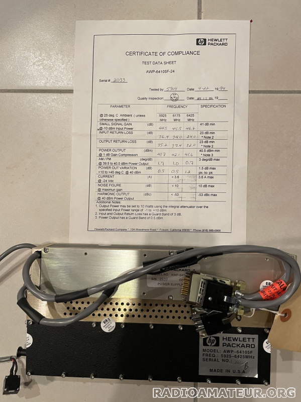 Vds Amplificateur de puissance état solide neuf, jamais utilisé, référence Hewlett Packard AWP-64105F-24 specs 5,9 - 6,4 GHz Pout > 10W Utilisable dans la bande amateur 5,760 GHz. Perfos à 5,9 GHz : Pout 1dBc : +41,7 dBm ; SSGain : 44,5 dB : niveau harmonique @ Pout +40 dBm : -53 dBc ; Return Loss entrée : 36,4 dB Alimentation 24V consommation < 3,6 A Ce matériel a été conçu pour remplacer les amplificateurs à TOP dans le milieu professionnel. A enlever de préférence à domicile (33), sinon coût de port à prévoir.