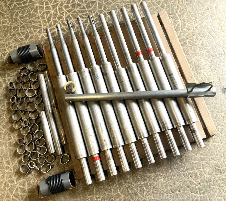 Bonjour merci de me lire, je me sépare des éléments suivants à savoir : Un petit mât télescopique composé de 4 sections (hauteur déployée 5,10 mètres et 1,60mètres en position repliée) poids du mât 10kg. Il est à noter que le système pneumatique est déficient surement manque d’étanchéité, je déployais personnellement les sections coulissantes à la main, le serrage des sections coulissantes nécessite une clef à tube de 10 mm. Diamètre du tube à la base : 85 mm eu haut : 45 mm Un trépied permettant son déploiement du mât de construction personnelle et très solide. Comme le montre les clichés proposés ce trépied est en deux parties et peu encombrant pour le stockage ou transport longueur totale replié (1,20 m) et poids de cet élément 10 kg. Le temps de montage 3 minutes maximum ne nécessitant qu’une clef de 13mm pour le serrage des 3 écrous.