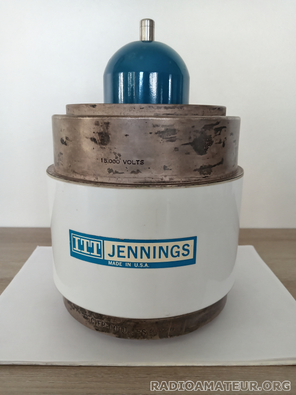 Condensateur variable sous vide Jennings CVPP-1000-15s , 50 à 1000pf 15000volts. Hauteur 26cm, diamètre 17cm, poids rendant impossible toute expédition. Occasion testée en parfait état de fonctionnement. Idéal pour un système d'accord particulièrement QRO ( antenne verticale HF bandes basses, long fil ou boite d'accord HF etc.). 73 de Thierry F6EYD.