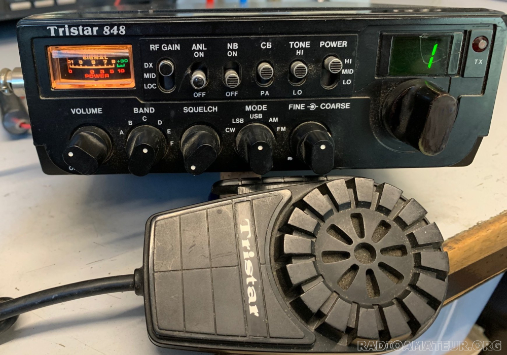Bonjour à tous, un transceiver CB TRISTAR 848 tous modes couvre de 26 075 à 28 355 P AM 8 W SSB 12 W avec micro et berceau mobile. Prix 70 Euros sur place à Cavaillon le 11 octobre, 73’s