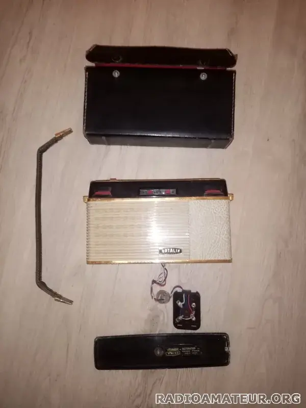Poste de radio avec protection en cuir ou skaï noir et intérieur velours rouge; poignée amovible. Curseur OK. Lampe HS. Réception PO et GO (C ;A) Alimentation par deux piles 4,5 V - 3LR12 Fonctionnel Bon état général. 24 x 19 x 5,6 cm 1,470 kg