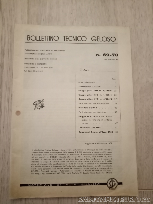 Bulletin technique dédié aux émetteurs-récepteurs Geloso En italien et en anglais En noir et blanc Décembre 1961 Livret souple sans couverture 56 pages 16,9 x 23, 9 cm 70 g