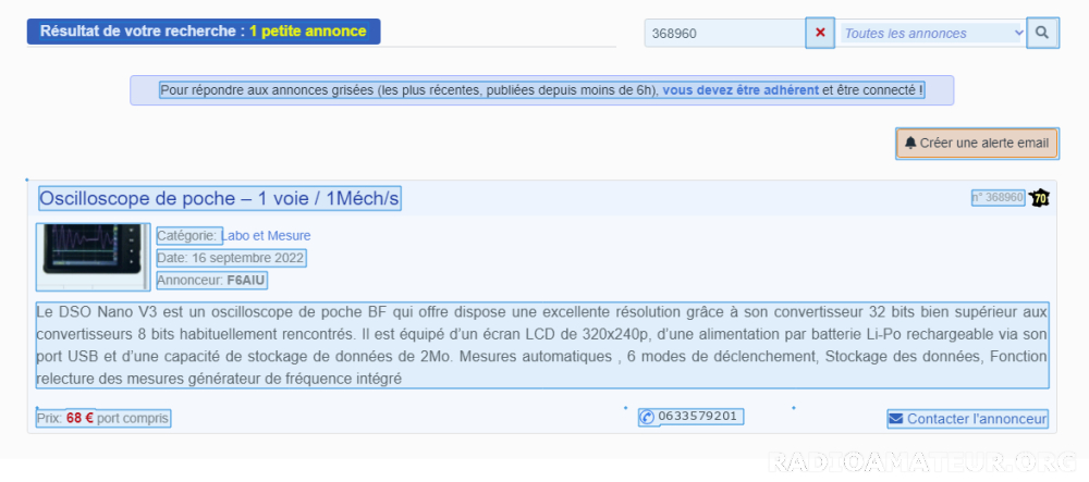 Je vends mon analyseur de spectre portable OWON HSA1016-TG, état neuf - 9 KHz à 1,6 GHz, avec générateur de tracking - dans sa mallette, avec documentation imprimée - la présentation et la documentation se trouvent facilement sur le net - expédition possible par Mondial Relay ou par la poste avec assurance - ou à venir essayer et prendre à Nîmes - voir mes autres annonces avec "f1fco" dans la case de recherche - F1FCO, Pierre à Nîmes