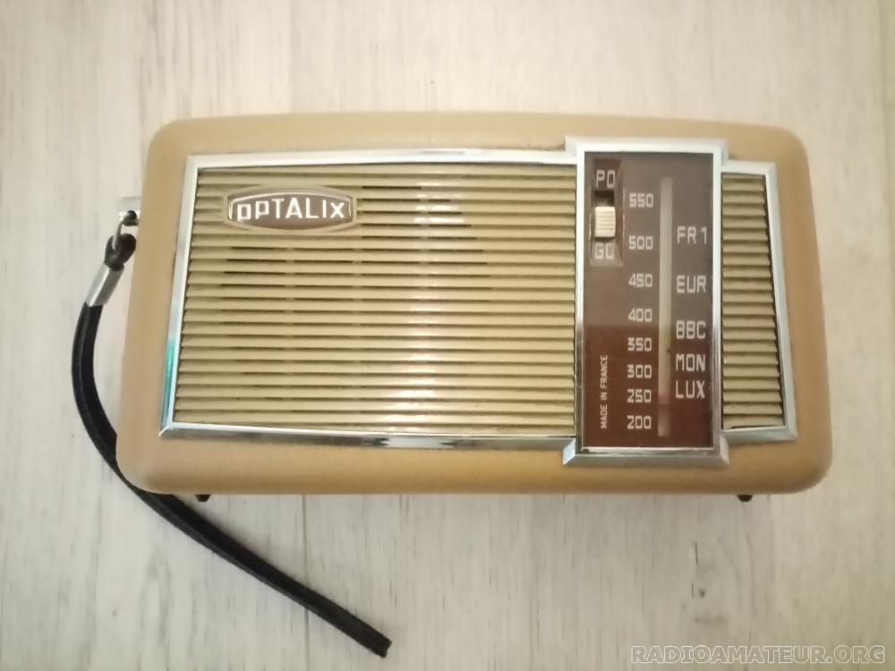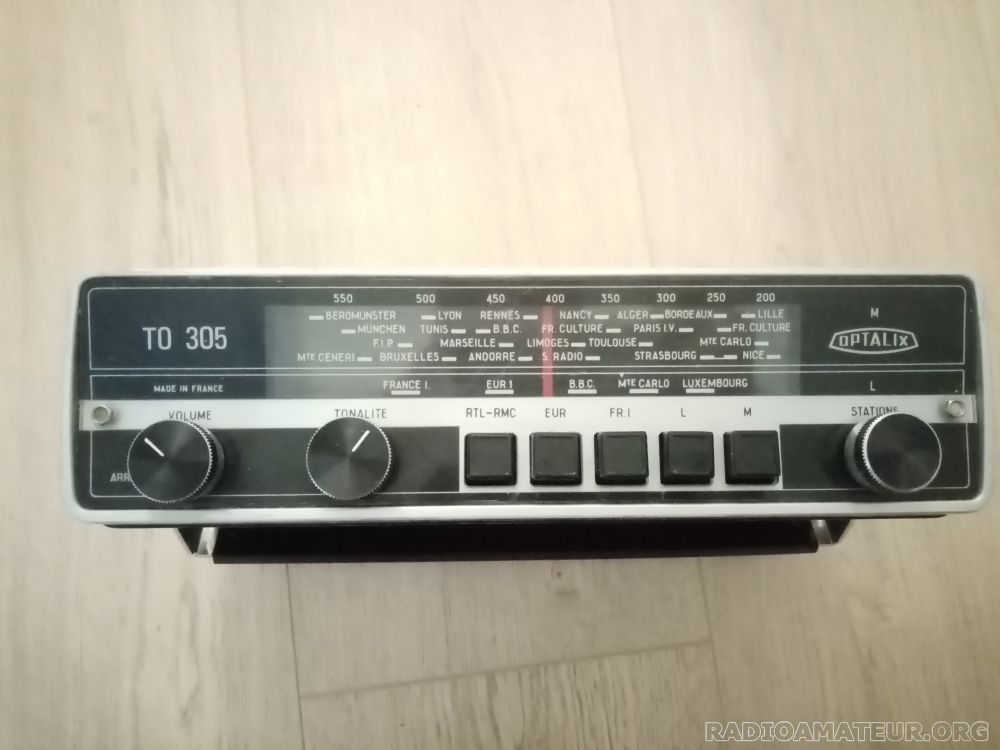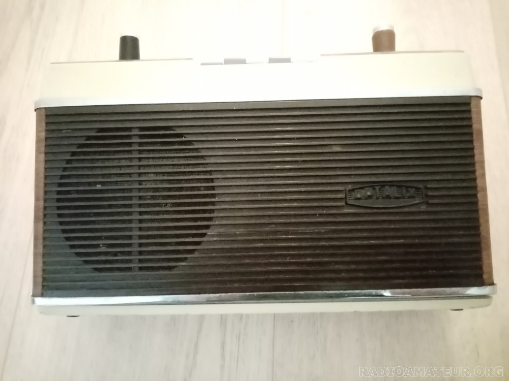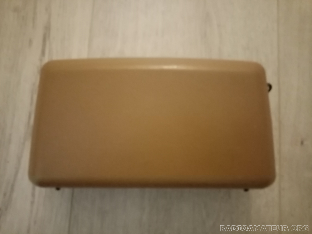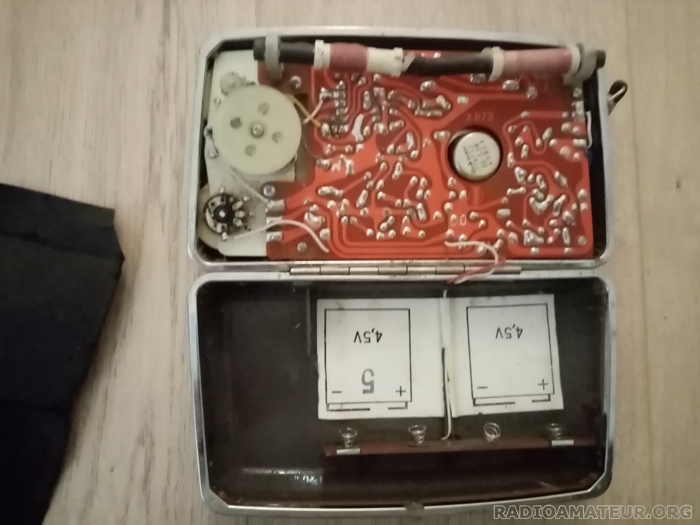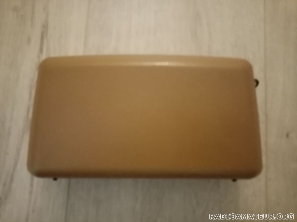Façade marquée. Nécessite un petit point de soudure entre le câble d'alimentation négatif et le ressort du logement à piles. Equipé d'un poignée Fonctionne avec quatre piles 1,5 V AA. Reçoit la FM, en plus des GO et PO. Bouton tonalité HS. 950 g 24,8 x 14,1 x 5,2 cm plus la poignée