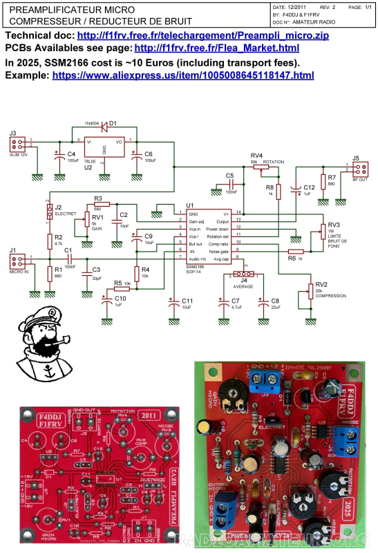 Circuit imprimé double face, percé, avec trous métallisés, avec vernis épargne et sérigraphie. Plus que 1 disponible. Dimensions 52 x 62 mm. Livré avec 3 connecteurs à vis (J1, J3, J5) et 2 connecteurs (J2 & J4) avec 2 jumpers. Toutes les documentations: schémas, nomenclatures, docs des composants etc. sont disponibles http://f1frv.free.fr/telechargement/Preampli_micro.zip QSJ: 5 Euros pour 1 jeu, si enlèvement à Conflans 78700. Avec frais de port recommandé, suivi et assuré (France METROPOLITAINE, 3A et C3 uniquement): 13 Euros pour 1 jeu. Paiement par PAYPAL. QSJ Postage fees included (outside METROPOLITAN France, 3A & C3 ) delivered against signature with insurance & tracking: 16 Euros for 1 set. Payment by PAYPAL. Download documentation http://f1frv.free.fr/telechargement/Preampli_micro.zip . D'autres avec composants CMS déjà soudés sont disponibles...