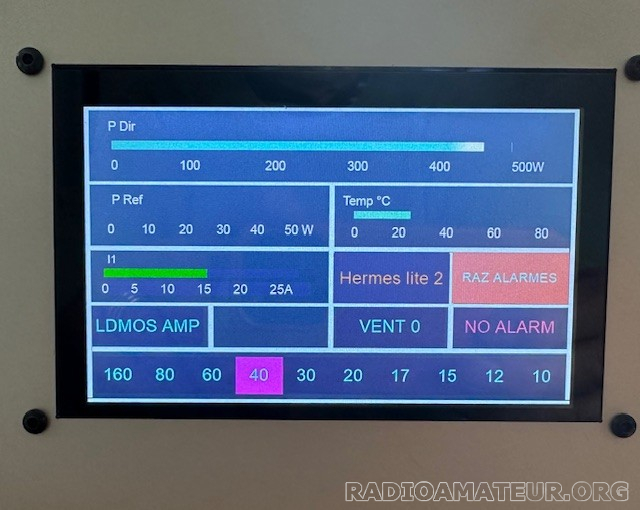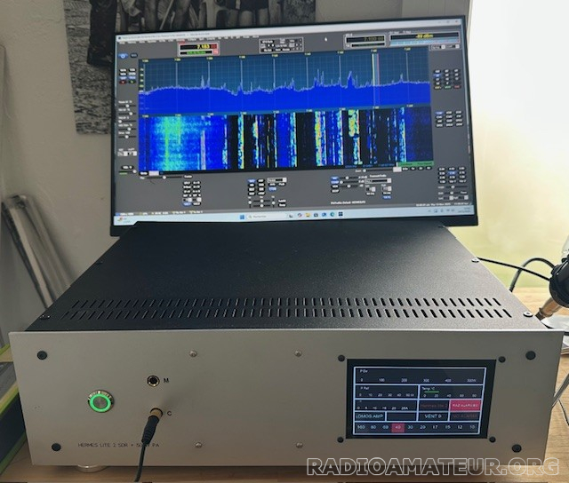 Pas toujours facile d'assembler une carte Hermes Lite avec un ampli de 400W et de configurer un PC avec THETIS. Je l'ai fait pour vous..! L'ensemble tient dans un coffret acier 19 pouces 3U (450x125x350) et contient : une carte Hermes Lite II, un amplificateur LDMOS 400W sous 50V, un pack de 9 filtres passe-bande en entrée réception , un pack de filtres passe-bas en sortie de l'ampli dimensionnés à 1.5kW, une carte d'interface entre la carte HL2 et l'amplificateur pour la gestion des filtres, affichage des puissances directe et réfléchie sur TFT 5 pouces tactile, gestion Arduino, un mini PC. Protection par double tandem-match, PSU 53 V/40 A, mini-PC 12 V Thetis installé et configuré (lancement automatique à la mise sous tension de l'ensemble), face avant alu 4 mm sérigraphiée. 2 connecteur USB et un connecteur HDMI Il ne reste plus qu'à connecter un moniteur HDMI et une souris et vous êtes entièrement opérationnel. Poids : 12kg