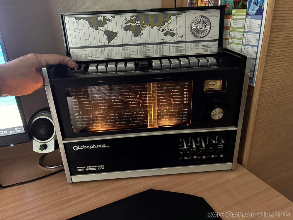 Récepteur Globephone ICF 2003 DX / (idem Marc NR52F1) Double conversion / 12 gammes : GO; PO; 5x OC / SW (bfo / réglage USB/LSB); FM;VHF;UHF; aviation... SW: 1.6 - 30 MHz UKW: 66 - 108 MHz VHF 108 - 178 MHz UHF: 430 - 478 MHz Fonctionne sur l'ensemble des fréquences y compris en 20/40/80 m avec réglage fin BFO. Très bon état esthétique (seul quelque touches du clavier ont été récolées sur les axes). Dimensions : L: 400 H: 270 P: 125 (mm) Sera emballé dans un double carton et expédié par mondial relay. Règlement par chèque ou virement. (idem radio amateur Yaesu / Icom ... )