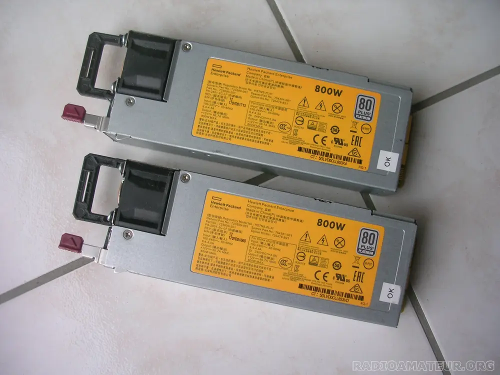 Vends 2 blocs alimentation compacts 12V DC 66A 800W HP Platinum HSTNS-PL41 pour réalisation d'une alimentation 24V 66A .Ces 2 blocs alimentation peuvent être mis en série pour obtenir 24V 66A. Ces blocs sont aussi modifiables pour atteindre chacun 13,8V ou 27,6V en série. La documentation est fournie pour les modifications. Prix de l'ensemble 40 Euros + port. Comptez 15 Euros de port via Mondial Relay et 19,50 Euros via Colissimo.
