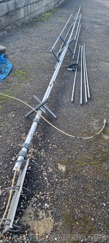 Vente pour la famille Labordes, Michel F1FIH(SK). Pylône télescopique basculant composé de 2 éléments de pylônes télescopiques de 6 m avec treuil manuel a la base, l'ensemble est basculant a la base,la chaise n'est pas disponible,le pylône est déposé au sol. 1 flèche triangulaire de 4 m basculante en point haut faisant office de cage rotor a double palier superposés, 1 tube galvanisé de 2" de 3,5 m de long pour support d'antennes avec un amortisseur de couple élastomère emmanché en bout du tube coté rotor,l'ensemble pylône est proposé a 800 euros. 1 rotor YAESU G-2000RC avec connecteurs et boitier de contrôle, proposé a 350 euros. Transport a la charge de l'acheteur , entièrement démontable comme suit : 2 éléments de 6 m et 1 élément de 4 m
