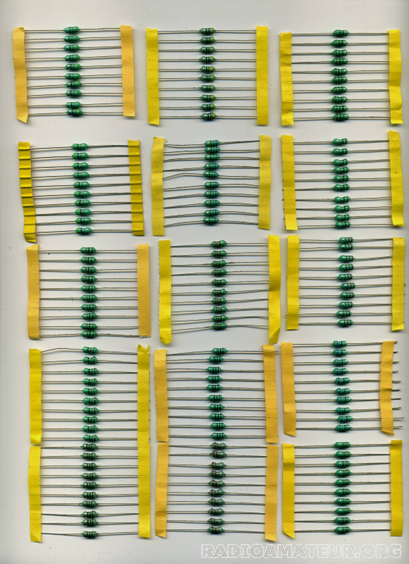 Lot de 150 inductances axiales miniatures neuves. Dimensions: 8 mm x 3,5 mm. 15 valeurs différentes, 10 selfs par valeur. - 10 selfs axiales de 1 µH. - 10 selfs axiales de 2,2 µH. - 10 selfs axiales de 4,7 µH. - 10 selfs axiales de 10 µH. - 10 selfs axiales de 22 µH. - 10 selfs axiales de 47 µH - 10 selfs axiales de 68 µH - 10 selfs axiales de 100 µH .- 10 selfs axiales de 150 µH .- 10 selfs axiales de 220 µH - 10 selfs axiales de 330 µH. - 10 selfs axiales de 470 µH. - 10 selfs axiales de 680 µH. - 10 selfs axiales de 1 mH. - 10 selfs axiales de 2,2 mH.