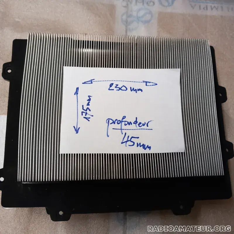Je propose plusieurs radiateurs en aluminium pour PA à transistors ou alimentation ou autres applications de grosse puissance. Dimensions: L=230mm l=175mm h=45mm. D'autres radiateurs de grandes tailles disponibles.