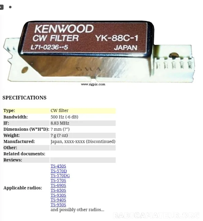Filtre Kenwood CW 500Hz YK-88C-1 excellent état de présentation et de fonctionnement, proche du neuf. Fonctionne avec KENWOOD TS450 TS570 TS690 TS850 TS930 TS940 TS950 TS950SDX etc... Prix 75€