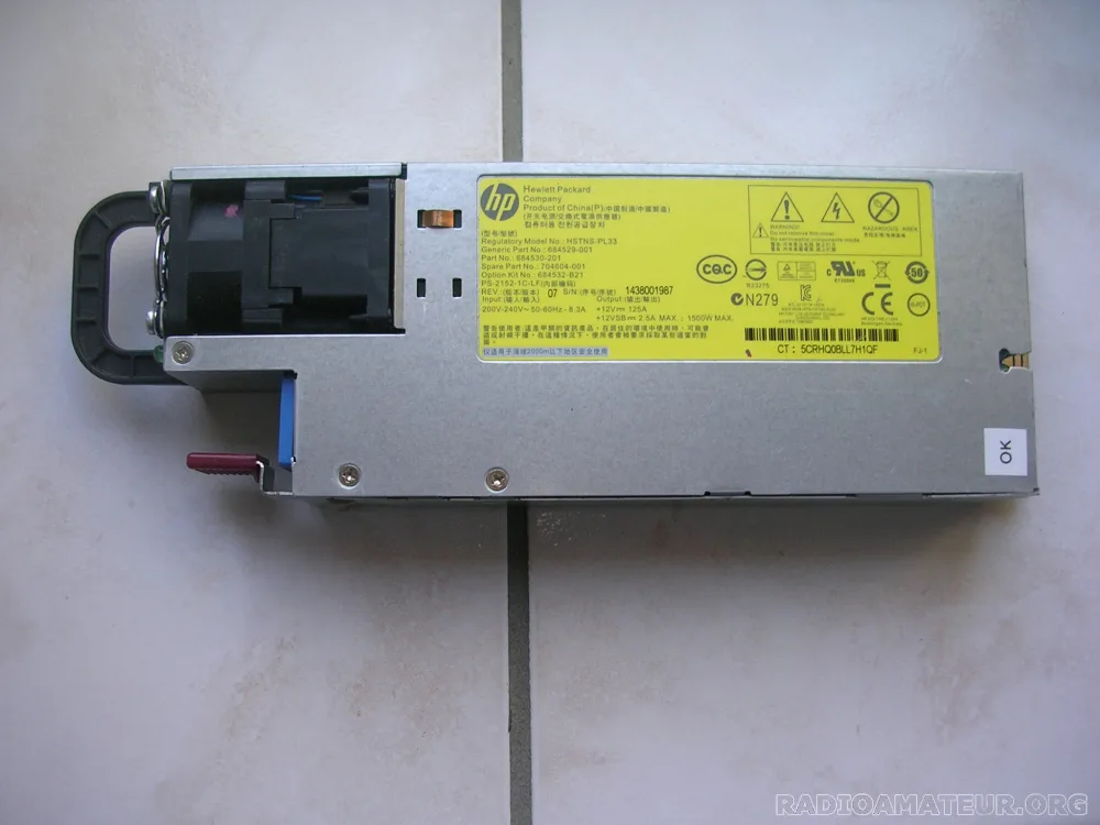 Vends bloc alimentation HP référence HSTNS-PL33 , entrée 220V et sortie 12V 125A modifiable en 13,8V, voir page de YO4HFU sur qsl.net . Livré avec documentation de raccordement et de modification + composants nécessaires. Prix 40 Euros + port & emballage ( Comptez 13,20 Euros via Colissimo ou 9 Euros via Mondial Relay ). Plusieurs unités disponibles.
