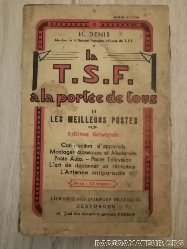Par H. Denis Sixième édition Octobre 1936 Construction d'appareils, montages classiques et modernes, l'art de dépanner le récepteur, l'antenne antiparasite Livre à la couverture marquée et tachée. 256 pages 13,6 x 21,2 x 2,1 cm 320 g Envoi par la Poste, Mondial Relay ou Shop2Shop ; remise en main propre sur Paris 13e (Olympiades)